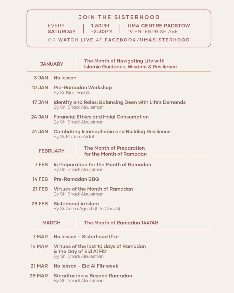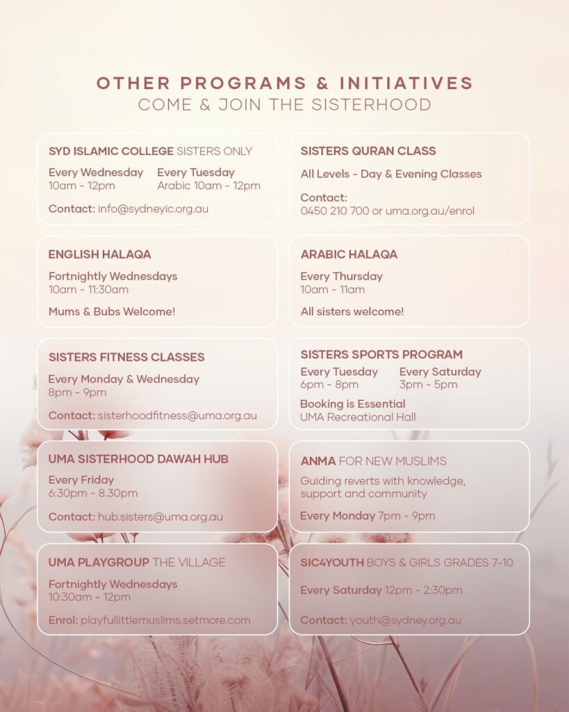 The gatherings have you acquire and utilise teachings, wisdoms and a greater sense of belonging which can only continue to enhance greater cohesion and strengthen the fabric of the Muslim Ummah. After all it is the strength of the Sisterhood that the Islamic Ummah gazes at as the yardstick to measure its future prominence. The UMA Sisterhood is located at the UMA Centre 19 Enterprise Ave, Padstow NSW 2211.