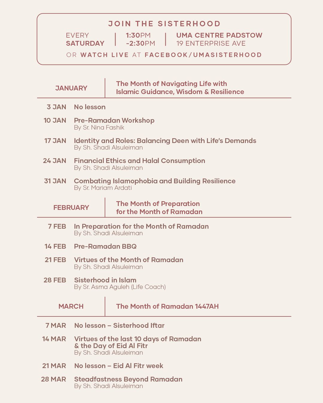 For further details please contact 0404 806 767 or sisterhood@uma.org.au