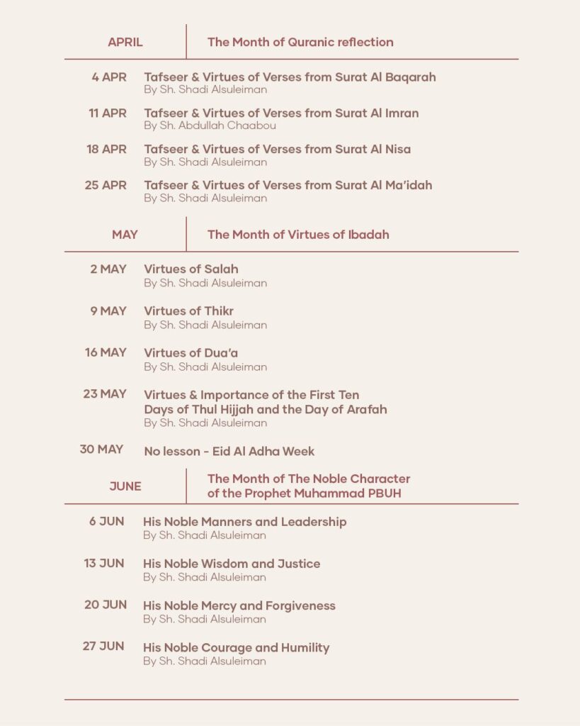 1.30pm – 2.30pm: Weekly lessons and lectures by Sheikh Shady Alsuleiman and various guest speakers.
